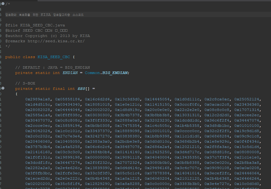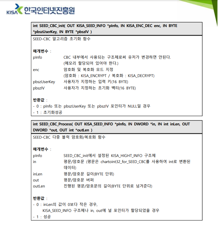 한국인터넷진흥원(KISA)에서 제공하는 KISA_SEED_CBC 알고리즘 소스 코드 기준으로 작성했습니다.