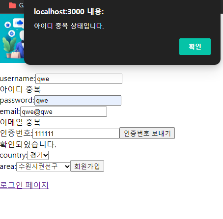 - existUsername은 현재 입력된 아이디가 중복된 아이디인지를 출력하기 위해 경고를 저장하고 출력하는 변수